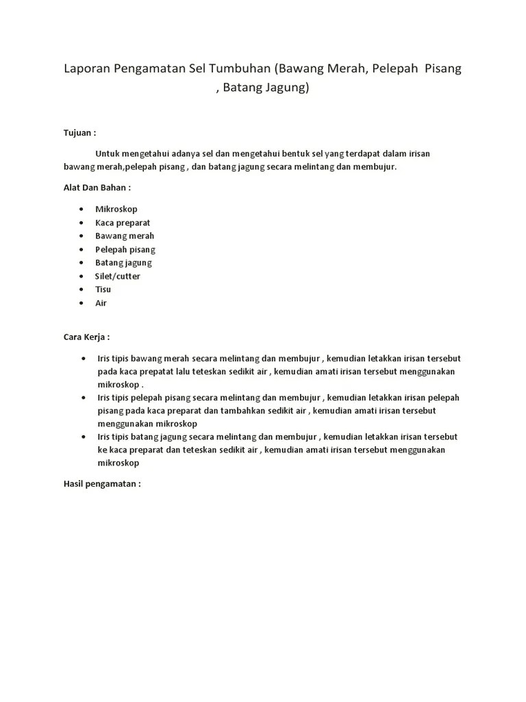 Melaporkan tanggung jawab sebuah tugas dan kegiatan pengamatan. Adapun objek pengamatan yang bisa diangkat dalam teks laporan hasil observasi, antara lain keadaan alam, keadaan lingkungan, hewan, tumbuhan, . Laporan hasil pengamatan pohon pisang posted: Siswa bersama guru melakukan apersepsi teks laporan hasil observasi. Pohon pisang merupakan salah satu jenis tumbuhan yang batangnya lunak dan tidak berkayu. Laporan praktikum i daun folium 1. Contoh teks laporan hasil observasi tentang buah pisang kumpulan . Program studi pendidikan biologi fakultas tarbiyah dan keguruan institut . Lho merupakan kepanjangan dari laporan hasil observasi. Hasil laporan observasi tentang pohon . Contoh laporan hasil pengamatan pohon pisang. Contoh teks laporan hasil observasi pohon pisang definisi secara umum pohon pisang . Dikaprasetyo teks laporan pohon pisang yuana d w.